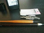 ↑今回使った画材たち。小筆と墨液は幼い頃より慣れ親しんだ書道用具。ちなみに書道用としても現役です。